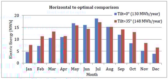 Using an optimization Genetic Algorithm, the optimal tilt angle was estimated to be 35° to extract maximum power from the installed PV panels. The results show that each year a 15 kW system can produce 26 MWh, a 30 kW system is estimated to produce 52 MWh, and a 40 kW system produces around 70 MWh. This makes a total of 148 MWh/year, which is around 12% higher than the horizontal PV panels. Figure 6 shows a comparison of the horizontal and optimal scenarios.