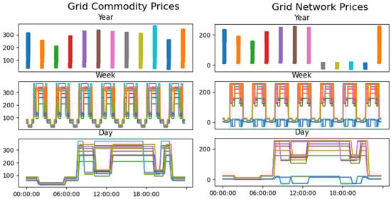 Figure 7 illustrates the commodity prices. Each color in Figure 7 represents different months, as per annual commodity and network prices (the top diagram in Figure 7). The same colors are kept to show weekly and daily changes in electricity prices in each month. Different timings of high and low prices are evident in the summer and winter months, as defined in Table 5, with each day having four different price levels. Specifically, electrical energy is less expensive during off-peak hours, which span from 22:00 to 8:00 (identified as Vazio zones in Table 5). The network costs exhibit a similar trend to the commodity costs. To simplify the analysis, a fixed tax rate of 23% was applied to both the commodity and network costs.