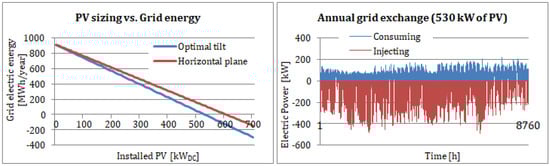 (Left) Grid exchange for different PV sizing; (right) annual electric energy balance for 530 kW PV.