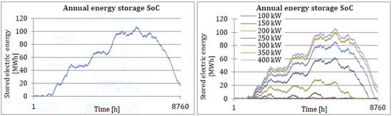 In order to achieve electric energy independence, more generation assets have to be installed. For this purpose, a scaling analysis was performed to show the dependence between installed PV power and utility electric energy exchange (Figure 12). It can be seen that, in the case of an optimal tilt angle (35°), the required PV installation is 530 kW to achieve electric energy independence, provided that battery storage is used. From Figure 12 (right), it can be calculated that 470 MWh/year of electric energy has to be stored and redistributed. For this purpose, to eliminate utility grid exchange, it is required to have substantial electric energy storage capacity. Figure 13 shows the required capacity using SoC diagrams in the case of unlimited charging power and in the case of seven different battery chargers. It can be easily concluded that the total storage capacity should be at least 110 MWh and that it should be charged using battery chargers with a total charging power of 450 kW. This solution would not be economically feasible due to high battery prices.