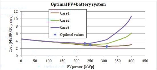 As the final step, a Genetic Algorithm was used to find the optimal PV+battery storage system size taking the PV installation price, battery prices and utility electric energy prices into consideration. The price range for electrical energy storage systems varies depending on several factors, including the type of storage technology, its capacity and the specific application requirements. Generally, battery storage systems, such as lithium-ion batteries, dominate the market and typically range from hundreds to thousands of EUR per kilowatt-hour (kWh) of storage capacity. However, prices have been steadily declining in recent years due to technological advancements and increased production scale. It is important to consider not only the initial investment cost but also factors like lifecycle costs, efficiency and system reliability when evaluating energy storage options. As the market continues to evolve and technology improves, it is expected that the price range for electrical energy storage will continue to decrease, making storage more accessible and widespread across various sectors of the energy industry. This analysis only illustrates that the optimal case, regarding the total system cost for a 20-year system lifetime, may not be the case with zero-electric-energy exchange, considering high electric energy storage prices. The optimization results are given in Figure 14 for the economic parameters from Table 11. It can be seen that for three different cases of battery prices, the optimal PV sizes are 230, 250 and 310 kWp.