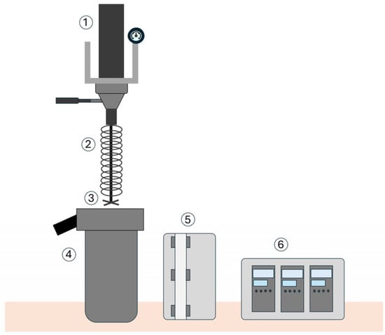 HTC set-up: 1—MagneDrive; 2—cooling coil; 3—mixer; 4—reactor; 5—heating jacket; 6—control panel.