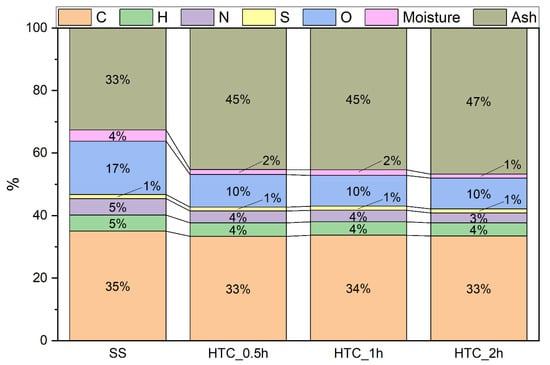 The ultimate and proximate analysis of the sewage sludge and the resulting hydrochar supported by energy parameters and HTC product distribution is denoted in Table 2 and shown in Figure 2. The final analysis indicated that the time of the HTC process does not significantly affect the content of individual elements, although the process itself slightly alters these proportions. The carbon content of the sludge was 35.02%, while the HTC process reduced this content by 4.74%, 3.80%, and 4.43% for HTC_0.5h, HTC_1h, and HTC_2h, respectively. These results correlate with the results of the study by Gaur et al. []. In contrast, the increase for hydrogen oscillated around 16–18%, and for nitrogen around 28–40%. The lower N content of the hydrochar showed that protein hydrolysis was enhanced during HTC of the SS, since N was mainly derived from proteins in the SS. The lower N content of the hydrochar also indicated that some N in the SS was transferred to the aqueous phase during HTC [].