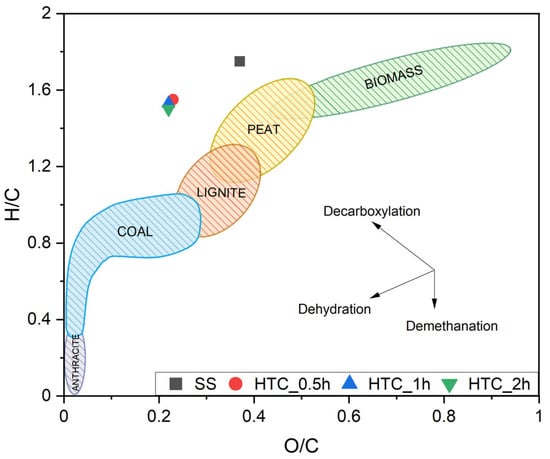 The chemical changes in the carbon-containing material are depicted in a van Krevelen diagram using atomic H/C and O/C ratios (Figure 3) []. The mechanism of the hydrothermal carbonization process starts within the hydrolysis of cellulose, hemicellulose, and extractive substance, followed by the demethanation, dehydration, and decarboxylation reactions. The pathways are illustrated in Figure 3. It was observed that the HTC process led to a significant change to the chemical and physical properties of hydrochar: the H/C and O/C ratios decreased, mainly due to dehydration and demethanation reactions. A similar trend was reported by Parshetti et al. [] and Saetea et al. []. The longer residence time of the HTC process also caused changes: the H/C and O/C ratios of the hydrochars approached values similar to those associated with lignite, and further dehydration and demethanation effects probably occurred in the process.