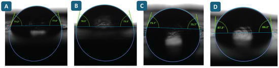 Contact angle determined on the liquid droplet on the surface of (A) raw sewage sludge, and (B) HTC_0.5h, (C) HTC_1h, (D) HTC_2h.