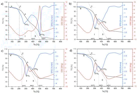 TG/DTG/DSC curves of (a) SS, (b) HTC_0.5h, (c) HTC_1h, and (d) HTC_2h.