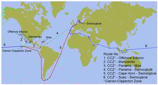 It was assumed that the transportation of PMNs from the CCZ would be carried out to the destination ports along the routes described in Figure 1.