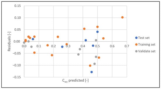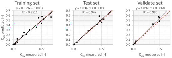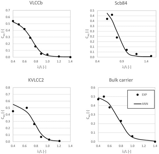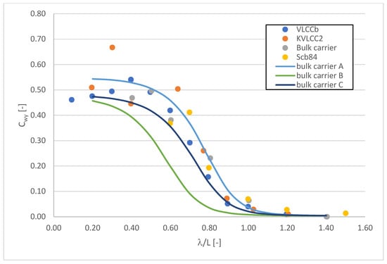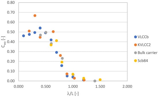 All data from these model tests are publicly available, and the references for each dataset are provided in Table 5. Figure 2 shows the values of the drift force coefficient (Cwy) in regular waves for these ship models at zero speed as a function of the ratio of the wavelength (λ) to the length of the ship (L). Based on the nondimensional coefficient Cwy, calculated using Equation (1) for the ship model scale, it is possible to determine the drift force Fwy for a full-scale ship of length L.