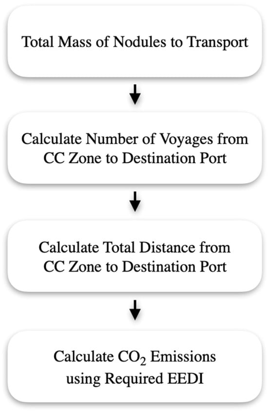 To achieve the research objective, the estimation of CO2 emissions during the loading and transportation of PMNs to various long-range destinations was identified as a key step. This estimation was conducted for each type of bulk carrier fleet, designated as A, B, and C, as described in Table 1, depending on the location of the destination port to which the PMNs were to be delivered.