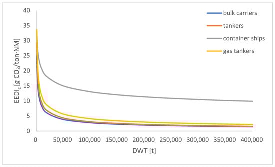 Studies [28,29] have shown that a large ship can transport a larger amount of cargo at once, burning relatively less fuel during transport to the destination, which translates into less environmental pollution. Therefore, to assess the energy efficiency of the ship, many indicators have been developed, such as