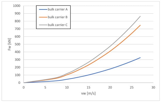To estimate the drift force (Fwy), results from ship model tests, the dimensions of which are presented in Table 5, were utilized. These results are based on the studies [39,40,41,42,43,44] and include the nondimensional drift force coefficient (Cwy), calculated using the following equation: