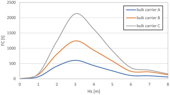 Values of fuel consumption FC [t] resulting from the operation of the DP system to counteract the drift force caused by wave action on bulk carrier C.