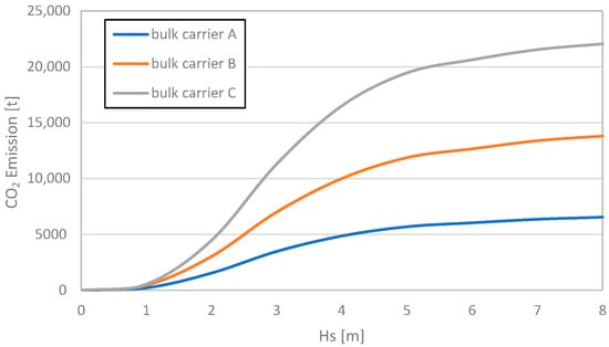 In addition to the technical limitations with regard to safe loading, a key aspect is the environmental pollution caused by the transporting ship during loading and transport operations. The total CO2 emissions into the marine environment by the transporting ship depends on the amount of fuel being burned [22]. This amount mainly depends on the power of the dynamic positioning (DP) system which stabilizes the bulk carrier at the loading site, as well as environmental conditions. The required power of the DP system depends on many factors, including the technical parameters of the ship and environmental conditions. Among the technical properties, the size of the ship is most important; according to Jurdziński [23], larger bulk carriers are characterized by a larger windage area, exposed to wind action, and a larger wetted surface, exposed to wave action, which may result in greater drift force. An increase in drift force leads to an increase in the energy needed to maintain the ship position, and thus an increase in pollutant emissions.