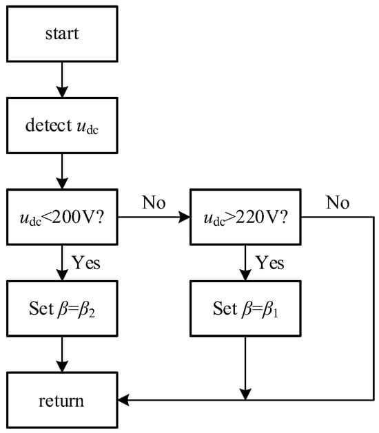 The control block II is the reference current generation block. Since i1A_fun was obtained in control block I, delaying it by one quarter of the fundamental period (equivalent to a phase lag of 90°), and then multiplying it by the control coefficient β gives the active current command i2p as shown in Equation (7). The control coefficient β is obtained based on the relationship between the target value udc* and the actual value udc of the DC voltage. The specific process is described in detail in the next paragraph.