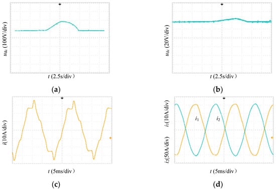 Figure 10d represents the output current of A-phase inverter (due to limitations in the number of oscilloscope channels, only one inverter output current is provided), displayed in the antiphase. The RMS value is 109.35 A, and the THD is 1.31%. Additionally, it can be seen that the RMS value, THD and waveform of the system current during simulation are very close to the test results by comparing