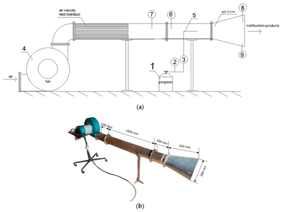 (a) Diagram of the experimental setup with measuring instruments: 1—gas cylinder (propane), 2—pressure gauge, 3—gas meter, 4—fan, 5—fuel supply tube, 6—multifunctional measuring system TESTO 454-P (Testo AG, Lenzkirch, Germany), 7—chromel-copel thermocouple, 8—chromel-alumel thermocouple, and 9—gas analyzer TESTO 350-XL (Testo AG, Lenzkirch, Germany). (b) Experimental setup with geometric dimensions.