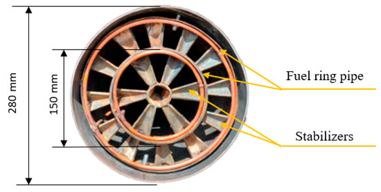 Corner stabilizers at the burner outlet provided microflame combustion, which resulted in low-emission combustion due to the absence of local high-temperature zones. The corner stabilizers, shaped like semicircles, created numerous flame recirculation flows that ignited fresh portions of the fuel–air mixture, thereby enhancing combustion stability.