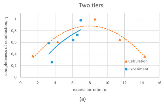 During the conducted experimental research of the simultaneous operation of both tiers (Figure 3a), it was found that the optimal air excess ratio to achieve high fuel combustion efficiency, calculated using Formula (1) (indicated as α air = 6.55 ÷ 6.96), coincided with the theoretical data, confirming a high fuel combustion completeness coefficient (η = 0.90 ÷ 0.99). This allowed for optimizing the operation of the two tiers, which is an important result of the research.