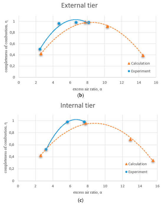 The dependence of the fuel combustion completeness coefficient on the air excess ratio during operation: (a) two tiers; (b) external tier; and (c) internal tier.