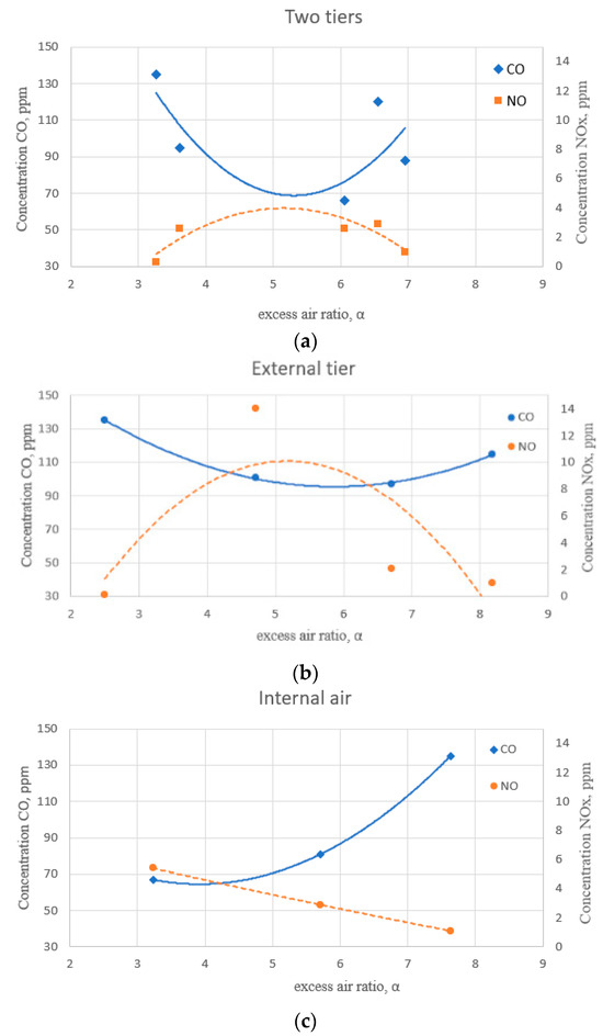 The optimal emissions of carbon monoxide and nitrogen oxides were observed at the following air–fuel ratio values: when both tiers operated simultaneously—α air = 6.06, CCO = 66 ppm, and CNOx = 2.6 ppm; for the external tier—α air = 6.70, CCO = 97 ppm, and CNOx = 2.1 ppm; and for the internal tier α air = 3.23 ÷ 5.71, CCO = 67 ÷ 81 ppm, and CNOx = 2.9 ÷ 5.4 ppm.