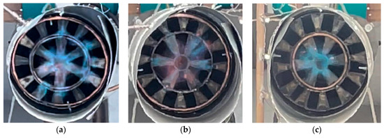 Similarly, in experiments with the operation of the external (Figure 3b) and internal (Figure 3c) tiers, optimal values of the air excess ratio (α air = 6.70 ÷ 8.19 and α air = 5.71 ÷ 7.63, respectively) were recorded, which aligned with the high values of the fuel combustion completeness coefficient (η = 0.98). These results confirmed the effectiveness of the selected operating modes of the tiers and could be used to optimize the combustion process in the gas turbine installation.