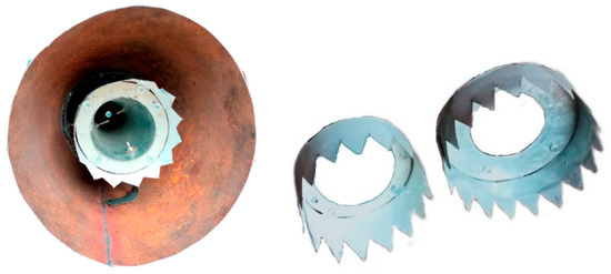 Cylindrical nozzles with slots at the outlet for the experimental setup were presented in two variants: d1 = 120 mm and d2 = 150 mm. The aim of the experiment was to select the optimal diameter for stabilization, ensuring stable combustion with low emissions of harmful nitrogen oxides. The general view of the cylindrical nozzles is shown in Figure 6.
