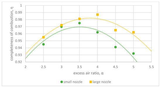 The dependence of the combustion completeness coefficient on the air–fuel ratio for the large and small burner nozzles.