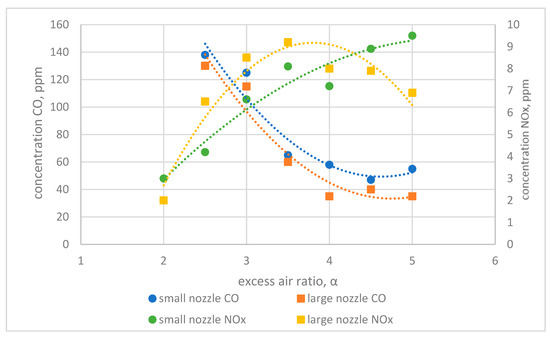 The lowest concentrations of nitrogen oxides were found with the larger diameter nozzle. Optimal carbon and nitrogen emissions were observed at the following excess air coefficient values: for the larger nozzle—α air = 3.5, CCO = 63 ppm, and CNOx = 8.8 ppm; for the smaller nozzle—α air = 3.5, CCO = 64 ppm, and CNOx = 8.5 ppm. Nitrogen oxide emissions did not exceed 10 ppm.