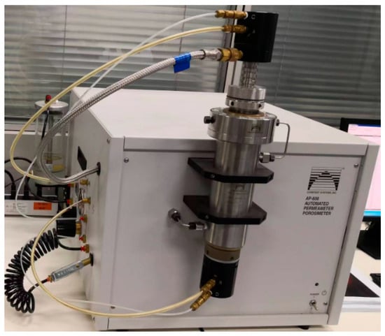 The AP-608 Automated Permeameter-Porosimeter (Figure 1), from Coretest systems, was used to measure the porosity and permeability of the Qingshankou Formation shale. The available confining pressure of the apparatus is 0–9000 psi, and the measurement ranges of porosity and permeability are 0.1–40.0% and 0.001 mD–10,000 mD, respectively. During the experiments, the oil-removed shale specimens were dried at 60 °C in the oven for 24 h before being placed in the core holder. The confining pressure was set at 3000 psi for the porosity and permeability measurements. The measured initial porosity and permeability of the selected shale specimens are listed in Table 1.