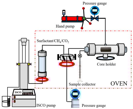 Multicycle huff-and-puff physical simulation experiments: The schematic depiction of the experimental apparatus is shown in Figure 2. The apparatus mainly consists of an ISCO pump, an intermediate container, a core holder, a hand pump, and two pressure gauges. In these experiments, the following assumptions were adopted: the samples can represent the geological characteristics of the target formation, and the damage to the specimens during processing can be ignored. After saturation, the oil distribution in the cores can represent the actual occurrence of crude oil in the formation. The physical simulation experiment meets the requirements of the main influencing factors, based on the similarity criteria. The experimental procedures are briefly described as follows. (1) Use the wire cutter to cut the specimen in half radially. (2) Place the specimen in the intermediate container and hold under vacuum for 24 h. Then, saturate the specimen with crude oil, and record the volume of oil saturated into the specimen. (3) Place the specimen in the NMR apparatus to obtain the T2 spectrum distribution to analyze the oil distribution under the saturated state. (4) Place the specimen in the core holder and constantly maintain the confining pressure at 2 MPa higher than the injection pressure. Continuously inject surfactant/CH4/CO2 into the specimen until the injection pressure reaches 30 MPa. Then, close the inlet valve and soak the specimen for 24 h. (5) After soaking, open the inlet valve and record the oil production. Then, obtain the T2 spectrum distribution using the NMR apparatus to analyze the oil distribution after the huff-and-puff process. (6) Repeat Steps (4) and (5) to perform four huff-and-puff cycles to analyze the EOR performance of surfactant/CH4/CO2 in the shale cores. The surfactant used in this experiment is a kind of petroleum sulfonate, with a concentration of 0.3 wt%. According to the conditions of the Qingshankou Formation, the pressure and temperature during these experiments were set at 30 MPa and 90 °C, respectively.