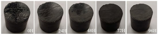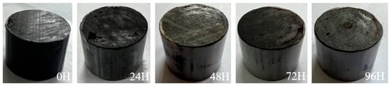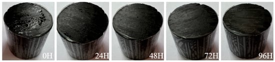 The photos of Specimen 2-1 at different stages of the huff-and-puff process are shown in Figure 5. The surface of Specimen 2-1 is dark black, with notable oil traces. As huff-and-puff proceeds, the specimen becomes drier, and the oil traces fade away. The color of the shale core also changes; it gradually becomes lighter in some zones. The stated phenomenon is significant when compared to that noted in the photos at 0 H and 96 H. It can be concluded that the injected CH4 effectively recovered oil in the pores of the shale during soaking.