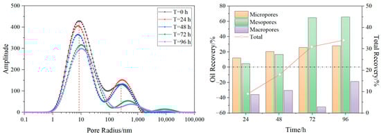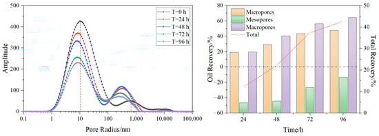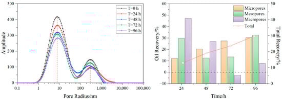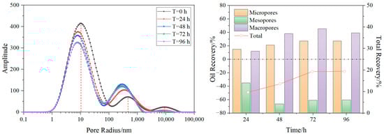 During the surfactant huff-and-puff experiment, the oil in the core is effectively recovered. After the first cycle of huff-and-puff, the oil recovery factor reaches 13.03%. The amount of oil produced in the small pores is significant—the amount of oil produced in pores with radii smaller than 50 nm (the small scale) is 12.12%; for those 50–500 nm (the medium scale), it is 29.76%; for those larger than 500 nm (the large scale), it is 47.31%. The oil recovery of the second cycle is 19.14%. Specifically, the amount of oil produced in the small pores is 20.36%, with a significant increase. However, as a part of the oil migrates from smaller pores to larger ones, the oil in the larger pores increases, and the amount of oil produced in medium (50–500 nm) and large (>500 nm) pores drop to 12.48% and 26.97%; both values are lower than those of the first cycle. The recovery factor grows to 23.62% and 29.82% after the third and fourth cycles, respectively. The amount of oil produced in the small pores continues to increase to 27.45% and 30.30%, respectively. That of the medium pores grows to 13.50% and 32.56% in the third and fourth cycles, while that of the large pores falls to −2.53% and 7.76%, respectively, due to the migration of the oil in the small and medium pores to the large pores.