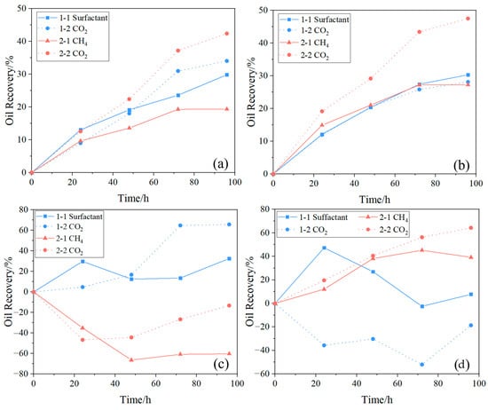 Comparative analysis of EOR effect during huff-and-puff of different media: (a) oil recovery of shale cores; (b) oil recovery of small pores; (c) oil recovery of medium pores; (d) oil recovery of large pores.