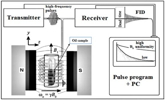 The application of NMR in the analysis of liquid fuels is well-established, with NMR spectroscopy routinely employed for the chemical characterization of liquid fuels and oils [8,9,10,11,12]. Additionally, NMR’s utility extends to well logging and the analysis of crude oil in rock cores, facilitating the assessment of various properties, including pore-size distribution, porosity and permeability of core samples, wettability, viscosity, and droplet size distribution [4,13,14]. Beyond its use in borehole data acquisition, NMR also plays a critical role in subsurface oil detection, utilizing the Earth’s magnetic field for geological exploration [15,16].