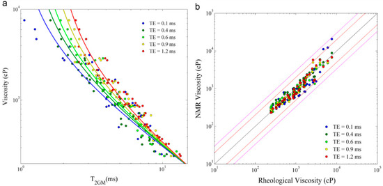 (a) shows a plot of viscosity against T2GM for nine heavy-oil samples within the 21–41 °C temperature range, with varying inter-echo spacings (TE = 0.1, 0.4, 0.6, 0.9, and 1.2 ms). (b) provides a summary comparing the NMR-predicted viscosities to rheological viscosities, with a standard deviation of 0.22 on a logarithmic scale. For easier comparison, the red and magenta lines represent NMR predicted viscosities that are either double or triple the values, whether higher or lower. Reproduced with permission from ref [54]. Copyright 2016 Elsevier.