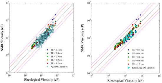 Comparative Analysis of LF-NMR Predicted Viscosities and Rheological Viscosity Measurements for Aged and Emulsified Heavy Oil Samples. Reproduced with permission from ref [54]. Copyright 2016 Elsevier.