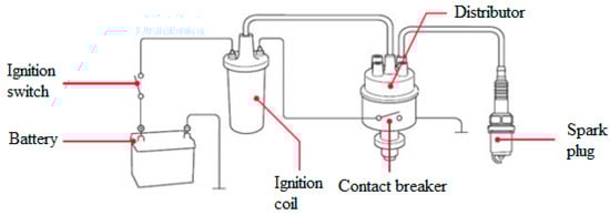 Although ignition systems have certainly evolved over time—in particular, with more and more electronic components—they still bear the hallmarks of the original coil ignition systems that were introduced more than 100 years ago. Petrol engines require an ignition source to cause an explosion of the mixture of air and fuel within the cylinder. There are four different fire systems, each with advantages and disadvantages, but all have the same basic goal: to effectively fire a quick explosion that burns all the fuel in the cylinder [16]. Electronic ignition is now used in almost all spark ignition vehicles, because conventional mechanical systems have more disadvantages: mechanical problems with contact breakers (limited life and difficult to adjust), current flow in the primary circuit is limited to 4 A, laws require strict emission limits and weaker mixtures require a medium voltage to ensure successful ignition, even at medium speed [34,35].