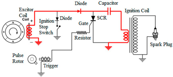 The capacitive discharge system (CDI) uses a capacitor, switch and transformer to store energy, then boost and release it through a spark plug (Figure 3). The capacitor is charged by a battery or a generator, then discharged through a transformer by a switch or a thyristor (SCR) [34].