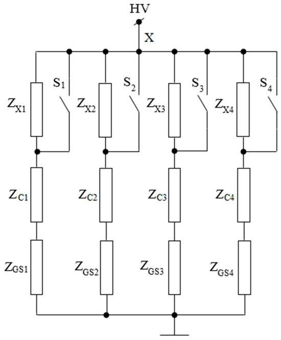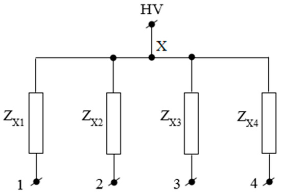 Figure 4 shows the electrical model for a medium-voltage ignition distributor that is not connected to the medium-voltage circuit. X marked the central terminal that connects to the induction coil (HV), and 1, 2, 3 and 4 marked the peripheral terminals that connect to the medium-voltage conductors that connect to the spark plugs through medium-voltage conductors. These impedances: ZX1, ZX2, ZX3 and ZX4, when they are a new medium-voltage distributor, have values of hundreds of GΩ to values of TΩ. With the duration of operation (usually expressed in the distance traveled by the vehicle), these impedances can decrease hundreds or even thousands of times, which worsens the quality of the spark obtained from the spark plugs. The decrease in the impedance value is due to the aging of the material, respectively, the dirt and moisture deposited on the outer surface of the distributor and/or the graphite dust and dirt deposited on the inner surface of the distributor. The most important effect is the aging of the electroinsulating material from which the distributor is built.