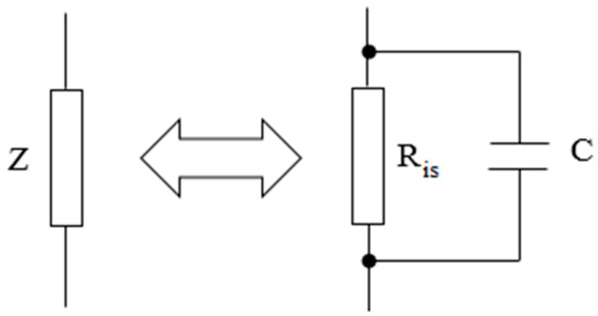 The impedances (the exception is the impedances ZC1, ZC2, ZC3 and ZC4) from Figure 4 and Figure 5 are made up of a very high insulation resistance Ris (of the order of GΩ or TΩs, depending on the type and aging) and a very small capacitance C (from pF to hundreds of pF, depending on the type). Each impedance consists of two components that are connected in parallel—Figure 6.