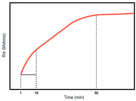 In order to design and operate electrical equipment and installations, certain safety measures and normal operations must be observed, which are always based on DC high-voltage (hundreds or thousands of V) insulation resistance measurements using megohmmeters. The isolation resistance is not constant over time [10,14,15]. Usually, the insulation resistance of electric insulation material changes over time, as shown in Figure 7.