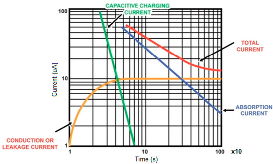 When a high voltage to the electroinsulating materials, initially, the current can be tens or hundreds of μA; after which, it decreases non-linearly in time to tens or units of μA (Figure 8). The current passing through the electroinsulating material consists of conduction or leakage current (initially, it has a value of 0; after which, it increases over time—a few seconds—to a stabilized value of tens of μA); capacitive charging current (initially, it has a value of hundreds of μA; after which, it decreases over time—a few seconds—to 0) and absorption current (initially, it has a value of tens of μA; after which, it decreases over time—a few tens of seconds—at a stabilized value of μA). The sum of the three currents determines the total current through the electroinsulating material. Megohmmeters apply a DC high voltage on the electrical insulating material and measure a very small current of the order of μA or nA and then apply Ohm’s law to measure the insulation resistance.