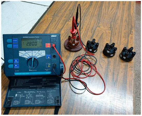 In the following experiments, the insulation resistance (Ris) of five different medium-voltage distributors was tested using the UNILAP ISO 5 kV, LEM (test voltages of 1 kV, 2.5 kV or 5 kV, measures up to 30 TΩ, Pi and Dar) megohmmeter [36]. The aspects of the measurements are presented in Figure 10. The experimental measurements in each graph (Figure 11, Figure 12, Figure 13, Figure 14, Figure 15, Figure 16, Figure 17, Figure 18, Figure 19, Figure 20, Figure 21, Figure 22 and Figure 23) were made in one hour (Ut is the test voltage). Measurements were made on distributors after they were used in ignition installations (Figure 10, Figure 11, Figure 12, Figure 13, Figure 15, Figure 16, Figure 18, Figure 20 and Figure 23), and in some measurements, distributors were used that were thoroughly cleaned (after cleaning) with alcohol on the inner and outer surfaces; after which, they were left to dry 24 h (Figure 14, Figure 17, Figure 19, Figure 21 and Figure 22). For the type D distributor, two successive chemical cleanings (with industrial alcohol) on the surfaces were carried out (Figure 21 and Figure 22).