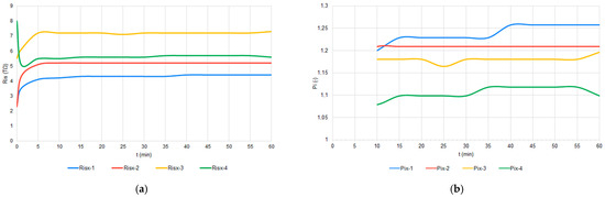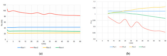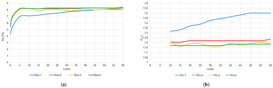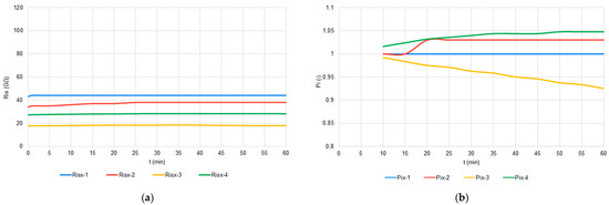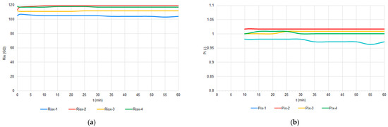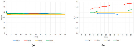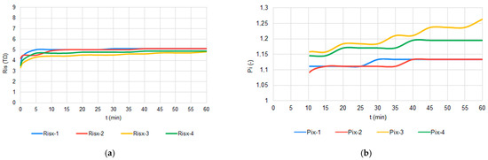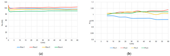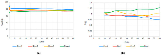 In Equation (2) usually, x = 10 min. In principle, Pi < 1.5 signifies bad insulation, Pi > 2 signifies good insulation, Dar < 1.1 signifies bad insulation and Dar > 1.25 signifies good insulation (these values are indicative). The values of Pi and Dar are used for estimating the quality of the insulation. This is achieved by plotting the insulation resistance depending on time and calculating the Pi and Dar values.