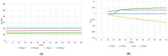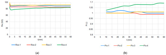 As a result of the experimental measurements, it was found that the insulation resistances between the terminals can be very different (tens or even hundreds of times, as it depends especially on the age) at different distributors (from new to old). Insulation resistances change value during the experiments. For used distributors, depending on the service life and material of the medium-voltage distributor, the insulation resistances can be tens to hundreds of GΩ (for old ones) to TΩ (on new ones)—Figure 11a, Figure 12a, Figure 13a, Figure 14a, Figure 15a, Figure 16a, Figure 17a, Figure 18a, Figure 19a, Figure 20a, Figure 21a, Figure 22a and Figure 23a. A longer operation of medium-voltage distributor uses leads to a decrease the insulation resistance by tens or hundreds of times (compared to the insulation resistance of new or newer distributors). At new medium-voltage distributors, dielectric absorption ratios and polarization indices have the highest values. Medium-voltage distributors new or newest with quality materials have an insulation resistance that increases over time (Figure 11a, Figure 12a, Figure 13a, Figure 14a, Figure 15a, Figure 16a, Figure 17a, Figure 18a, Figure 19a, Figure 20a, Figure 21a, Figure 22a and Figure 23a).
