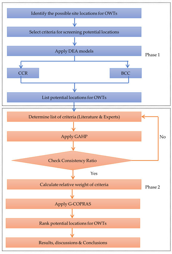 To fill this gap and contribute to the literature on OWT, an effort has been made in this study to identify the suitable locations for OWTs in India using an integrated approach of DEA, GAHP, and GCOPRAS. Regarding this, the criteria that need to be considered in the installation of OWTs are collected along with the possible locations in India where OWTs could be installed. With DEA, the potential locations for OWTs are filtered out based on the performance of quantifiable dimensions (wind speed, wave height, water depth, and energy demand). Next, using GAHP and GCOPRAS, the locations were analyzed and ranked based on criteria (climatic conditions, regional features, investments and benefits, environmental impact, economic impact, and social and technical impact).