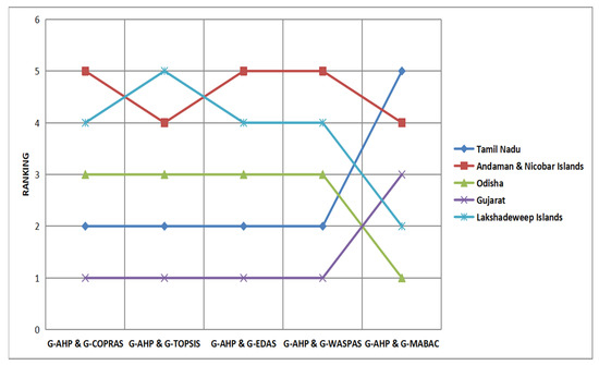 To check the reliability and robustness of the obtained results, the outcome is compared with results generated using other alternative ranking MCDM techniques such as GTOPSIS, Grey Evaluation based on Distance from Average Solution (GEDAS), Grey weighted aggregated sum product assessment (GWASPAS), and Grey Multi-Attributive Border Approximation area Comparison (GMABAC). The results obtained using five kinds of alternative selection techniques are provided in Table 9 and are visually presented in Figure 2. In four techniques, L12 occupies the top position, and only one technique, L08, secures the pole position. When viewed from a larger perspective, almost in all the five alternative selection techniques, the top three positions are variably occupied by the same locations (L12, L08, and L02). From this, it was understood that the integrated approach used in this study is robust, and the results obtained are also reliable. Hence, the outcome of this study can be used as a guideline by the policymakers and government in selecting the location for OWTs.