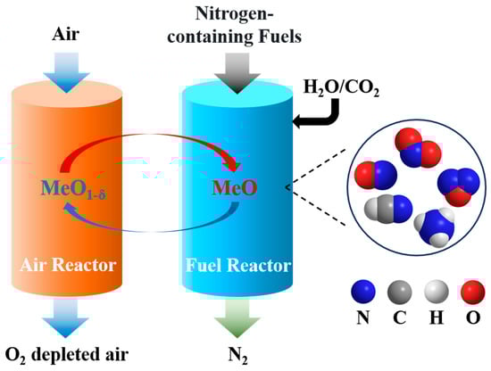 During the combustion and utilization of fuels such as coal, sewage sludge, and biomass, the nitrogen content in these fuels can be transformed into N-containing pollutants like HCN, NH3, NOx, and N2O [26]. The accumulation of these pollutants in the environment can disrupt the nitrogen cycle [27], leading to issues such as photochemical smog, acid rain, ozone layer depletion, and exacerbation of global warming. Excessive inhalation of these pollutants by humans can result in severe diseases such as renal failure, cancer, and blue baby syndrome [28,29]. Consequently, there is an urgent need to reduce the emission of nitrogen-containing pollutants during fuel utilization. As shown in Figure 1, scholars [30,31,32,33] have applied chemical looping technology to remove nitrogen pollutants. Compared to traditional combustion, chemical looping technology reduces the formation of thermal and prompt NOx pollutants through indirect contact combustion of fuel with air and lower reaction temperatures. Moreover, since there is no gaseous molecular oxygen present in the fuel reactor, the oxidizing effect of the reaction atmosphere is significantly weakened, which decreases the probability of fuel-bound NOx formation [34,35,36,37].