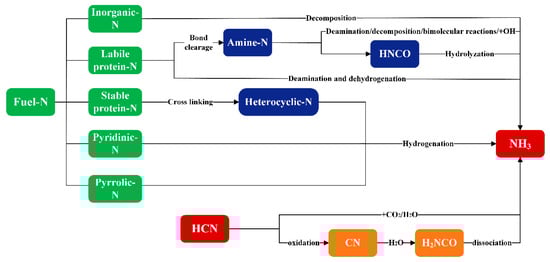 The formation pathways of NH3 and HCN are depicted in Figure 2. The main sources of NH3 include inorganic-N, protein-N, pyrrole-N, and pyridine-N in the fuel. During the CLP, inorganic-N, being unstable, decomposes directly to form NH3 in the initial stages of the reaction [40,41,42]. Part of the unstable protein-N is converted to NH3 through deamination and hydrogenation reactions, while the remainder undergoes bond cleavage to produce amine-N, which is further converted to NH3 through deamination, decomposition, bimolecular reaction, or reaction with hydroxyl radicals (OH). Additionally, amine-N reacts with hydrogen radicals (H) to form HNCO, which decomposes into NH3 upon hydrolysis [40]. Stable protein-N forms heterocyclic-N through crosslinking, which can be directly hydrogenated to NH3. Pyrrole-N and pyridine-N are also converted to NH3 through hydrogenation reactions [43]. During oxidation, HCN forms CN, which reacts with H2O to form H2NCO. These amide groups dissociate to form amine groups and further hydrogenate to form NH3 [44,45]. Moreover, HCN can also be converted to NH3 by reacting with CO2 and H2O [45,46].
