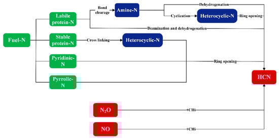 The formation pathway of HCN is depicted in Figure 3, with the main precursors being protein-N, pyrrole-N, and pyridine-N in the fuel. Unstable protein-N can be converted to NH3 through direct deamination and dehydrogenation reactions or through bond cleavage to form amine-N. Amine-N can further cyclize to form heterocyclic nitrogen, which can then be converted to HCN through ring-opening reactions [40,41,42]; alternatively, amine-N can be directly converted to HCN through dehydrogenation reactions. Stable protein-N forms heterocyclic nitrogen through crosslinking reactions [41]. Heterocyclic-N, pyrrole-N, and pyridine-N can be converted to HCN through hydrogenation and ring-opening reactions [43]. Additionally, N-containing compounds formed during the reaction may also participate in secondary reactions, further promoting the formation of HCN. Under conditions with a low N2O/NO to CH4 ratio (less than 0.2), N2O and NO can react with CHi to generate HCN [47].